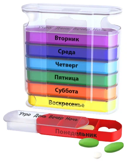 Таблетница DASWERK таблетница / Контейнер-органайзер для лекарств и витаминов “7 дней/4 приема CLEAR” DASWERK, 630846Таблетница DASWERK предназначена для надежного хранения лекарств, витаминов и пищевых добавок. Контейнер из легкого и прочного пластика гарантирует удобство и безопасность в использовании. Таблетница представляет собой 7 ежедневных контейнеров с 4 отделениями каждый, расположенных в удобном органайзере, который позволяет упорядочить прием лекарств по дням, переставляя контейнер с нужным днём наверх. Ежедневные контейнеры надежно закреплены внутри органайзера, благодаря чему можно взять с собой как всю таблетницу, так и отдельные, более компактные, контейнеры на один день. Дома, на работе, в путешествии – упорядоченный прием лекарств и витаминов станет проще с таблетницей-органайзером. Контейнер содержит маркировку на русском языке. Каждому дню недели соответствует разный цвет контейнера. Прозрачная крышка позволяет без труда контролировать прием лекарств. Перед первым использованием рекомендуется промыть контейнеры теплой водой с мылом и тщательно высушить. Количество дней: 7. Количество ячеек: 28. Серия: DAS HAUS. Длина: 113 мм. Ширина: 42 мм. Высота: 127 мм. Материал: пластик Бренд – DASWERK. Производитель – Китай. . Штрихкод – 4606224332307Характеристики упаковки: Вес: 0,1990 кг. Объем: 0,0009 м3. Размеры: 4,6×13,2×12,1 см.